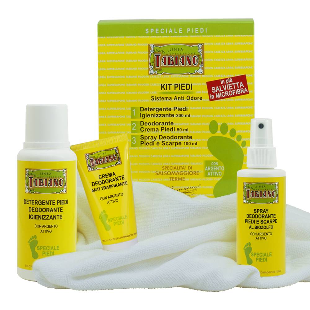 Kit composto da 3 prodotti per una routine anti-odore completa ed efficace.DETERGENTE PIEDI DEODORANTE E IGIENIZZANTE 200mlCREMA DEODORANTE ANTI TRASPIRANTE 50mlSPRAY DEODORANTE PIEDI E SCARPE 100mlE in più una morbida salvietta in microfibra molto assorbente. Si può lavare a mano o in lavatrice anche a 60° e asciuga in poco tempo.misura: 40x73 cm